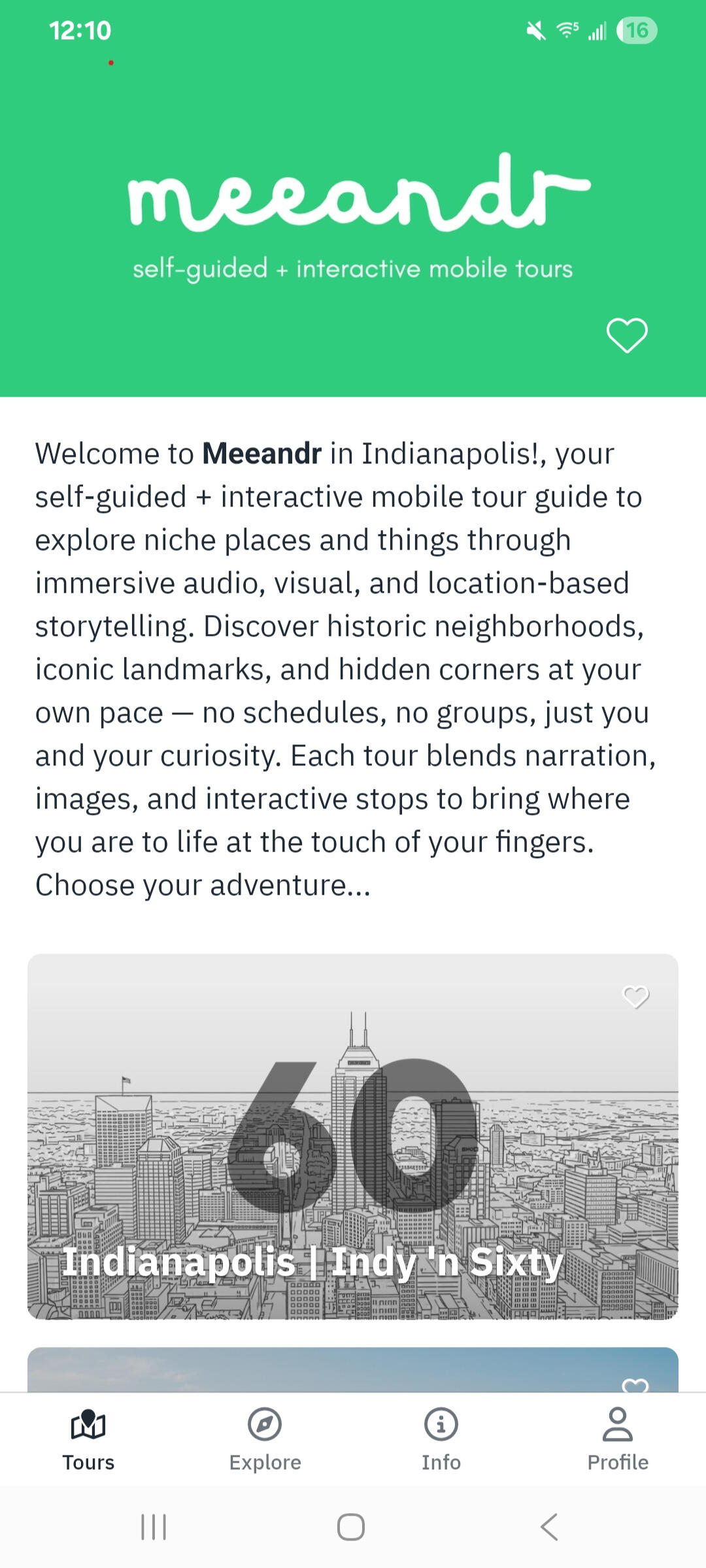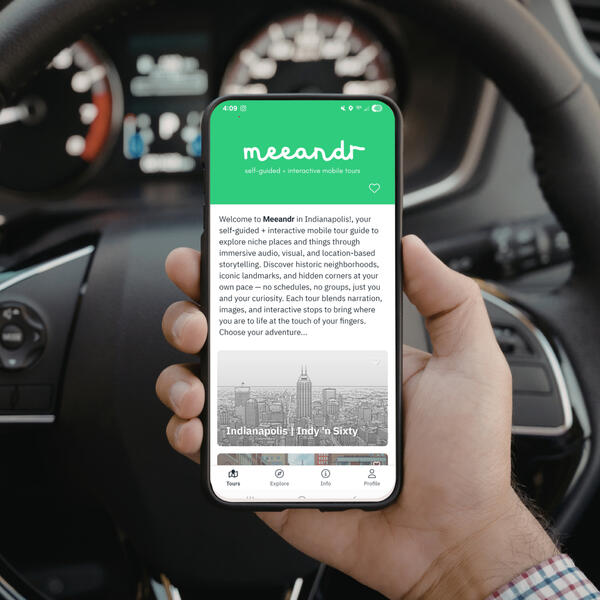 Meeandr brings niche, local stories and hidden gems to life through self-guided, interactive mobile tours that move at your own pace. Images and video pop up at your fingertips, created by a 6th generation Indy native. Stop being a tourist—start being an explorer. Get the Meeandr app designed for tourists and locals!